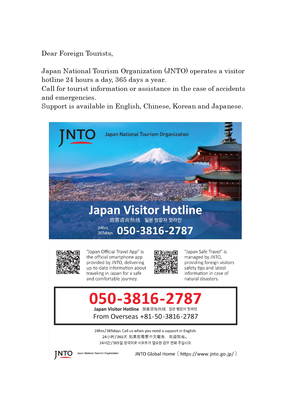 일본정부관광국(JNTO)에서는 1년 365일, 하루 24시간 내내 응대 가능한 다국어 콜센터 ‘재팬 비지터 핫라인/Japan Visitor Hotline’을 운영하고 있습니다.