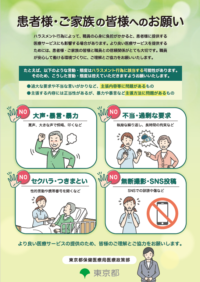 東京都では、在宅医療現場の安全を確保し、安心して従事できる環境を整えることを目的として、在宅医療現場におけるハラスメント対策事業を実施しております。