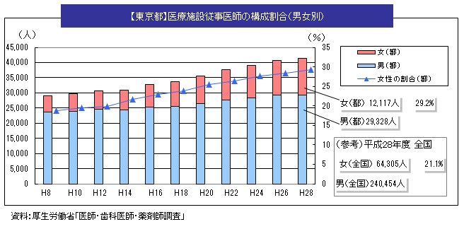 - 医療施設従事者を性別でみると、男性は29,328人、女性は12,117人となっています。女性医師の占める割合は年々高くなっており、都では29.2%と、全国の21.1%と比較しても高い割合となっています。特に、比較的若い世代での女性の割合が高くなっています。