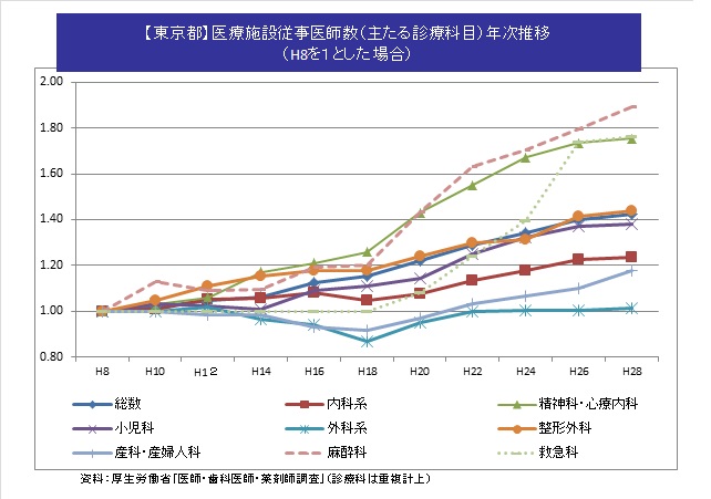 - 都内の医師総数は増加が続いている一方で、診療科によって状況が異なっており、産婦人科など医師の確保が求められている診療科もあります。
