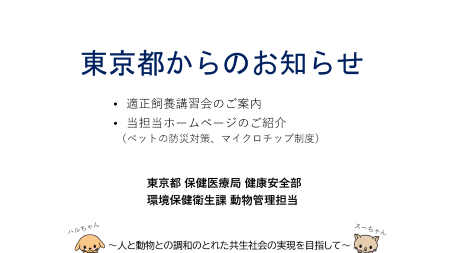 東京都では、動物の愛護及び適正な飼養等の推進を目的として、ペットの正しい飼い方に関する講習会を開催しています。