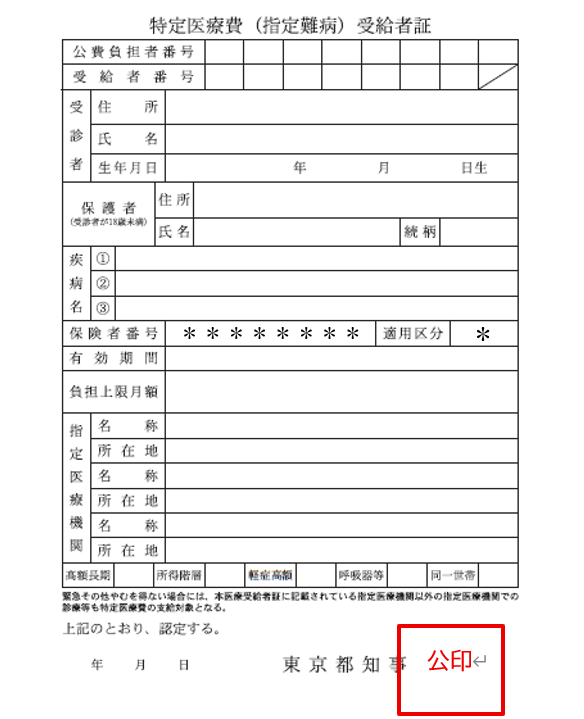 認定を受けた場合、特定医療費(指定難病)受給者証が交付されます。