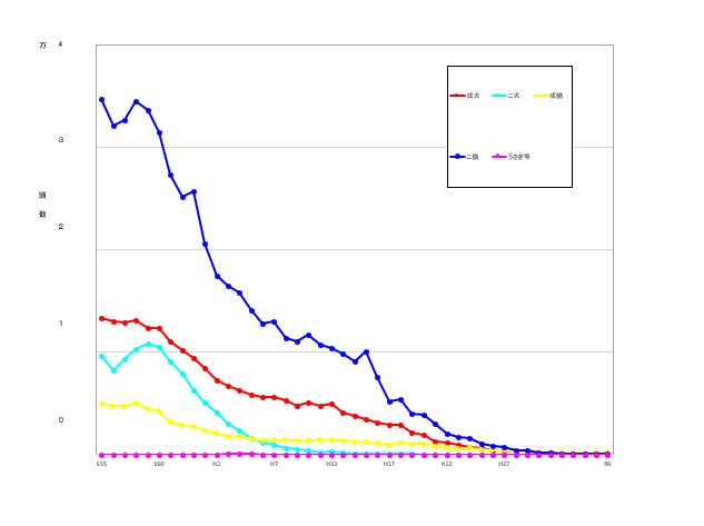 | 年度 | 成犬 | こ犬 | 成猫 | こ猫 | うさぎ等 | 総取扱数 |