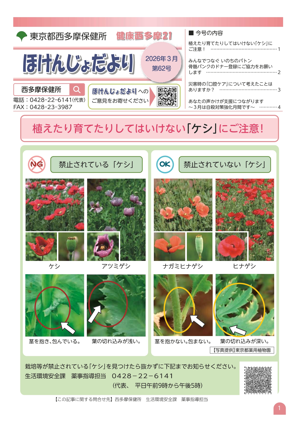 - 「ほけんじょだより」には、目の不自由な方のための音声コードが掲載されております。上記PDFから音声コードが読み取れない場合は、お手数ですがリーフレット版を御利用ください。リーフレット版は、西多摩保健所の窓口で配布しております。