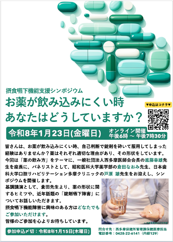 西多摩保健所では、摂食嚥下機能障害に興味のある方を対象にオンラインでシンポジウムを開催します。