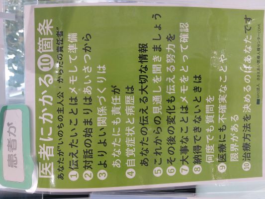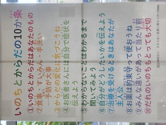 安心、安全、納得のいく医療を受けるためには、医療者側、患者側の双方の取組みが必要です。10のポイントをお互いに心掛けましょう。また、自分の健康は自分で守るために、いのちとからだの10か条も大切なポイントですので、ぜひ覚えておきましょう。